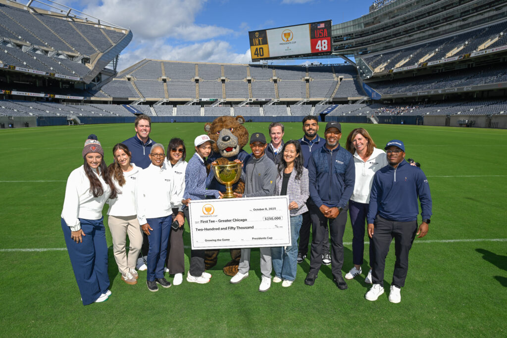 The donation was presented during a special event at Soldier Field on Wednesday, October 8 as part of Presidents Cup Captains’ Visit. The event brought together U.S. Team Captain Brandt Snedeker and International Team Captain Geoff Ogilvy for a press conference marking the one-year countdown to the 2026 Presidents Cup at Medinah Country Club. Following remarks, the festivities continued with a charity shootout benefiting First Tee – Greater Chicago, which was formatted into a spirited U.S. vs. International competition.